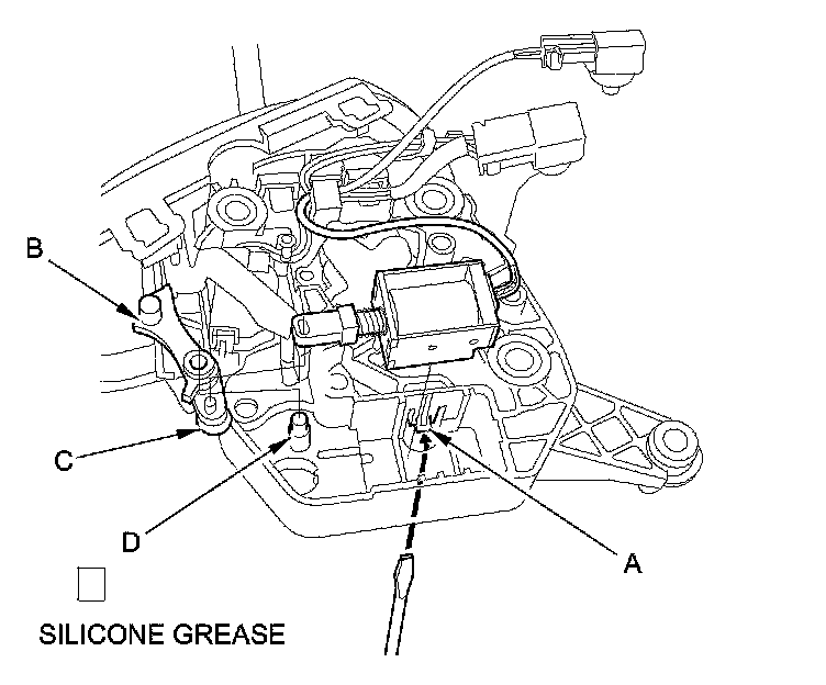 5. Apply silicone grease to the pin (D) of the shift lever bracket, then install the shift lock stop over the pin.