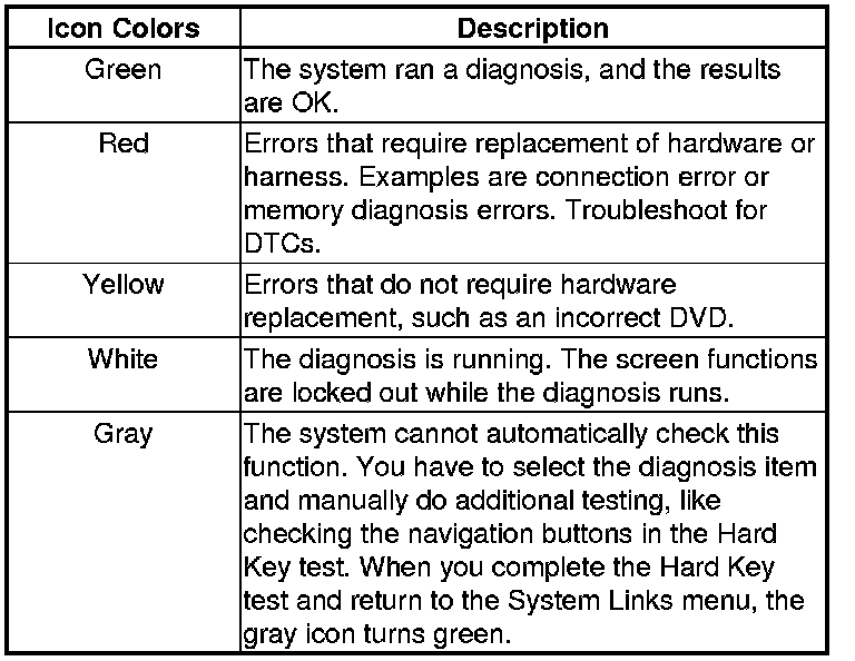 When the diagnostic finishes, the icons turn different colors based on their test status. The color definitions are shown following, and can also be seen by selecting Help on the System Links screen.