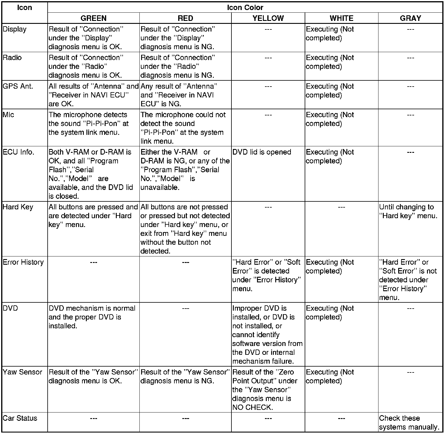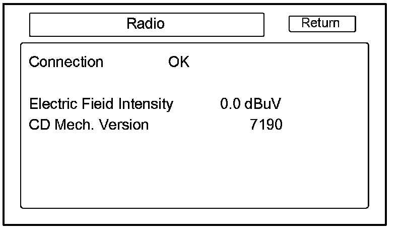 This diagnostic screen checks the internals of the radio (AM and FM) and the CD player. If NG is indicated, replace the audio-navigation unit.