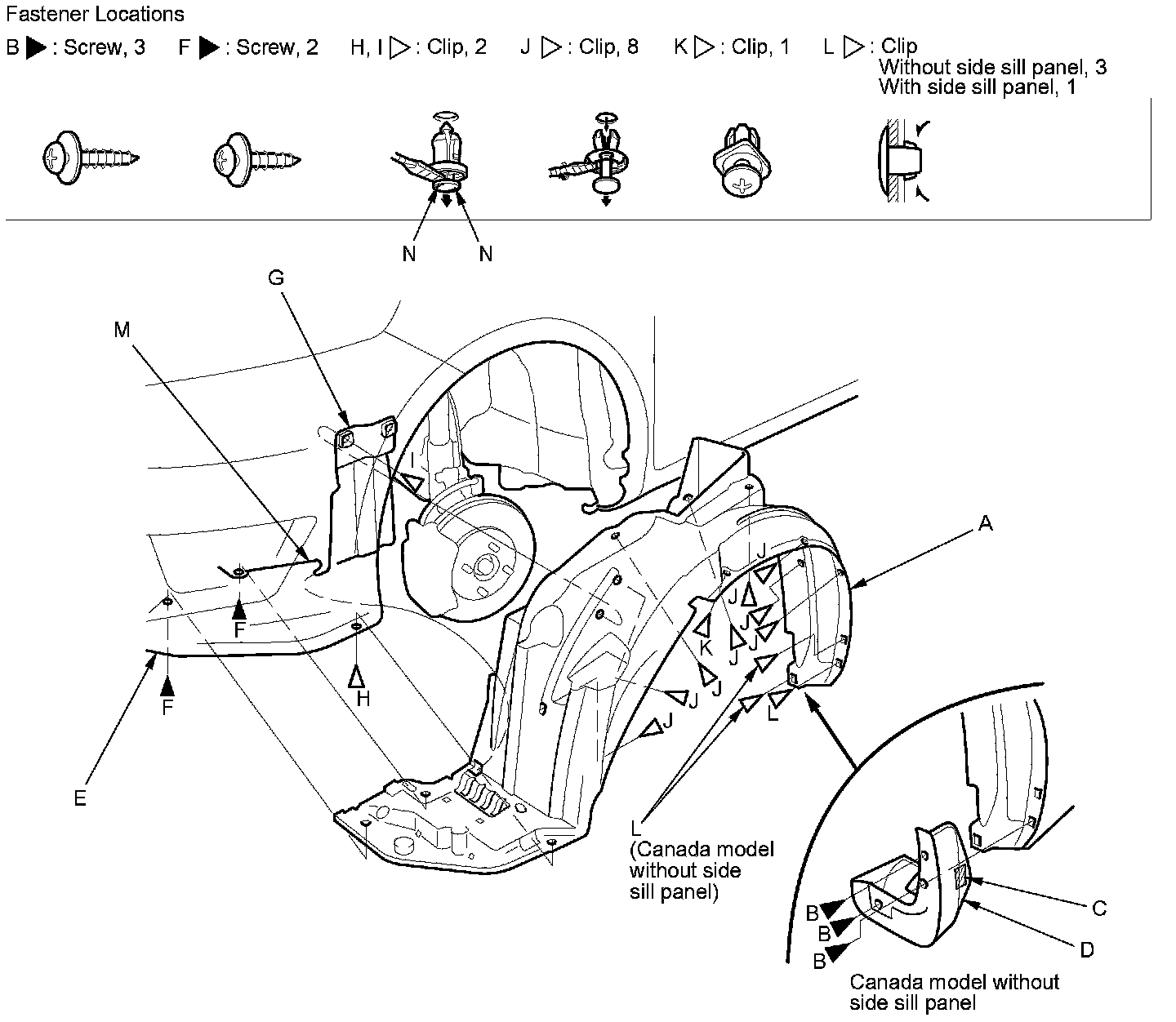 1. Canada model without side sill panels: On the back of the wheel arch, remove the screws (B), release the adhesive tape (C) from the body, and remove the front splash guard (D).