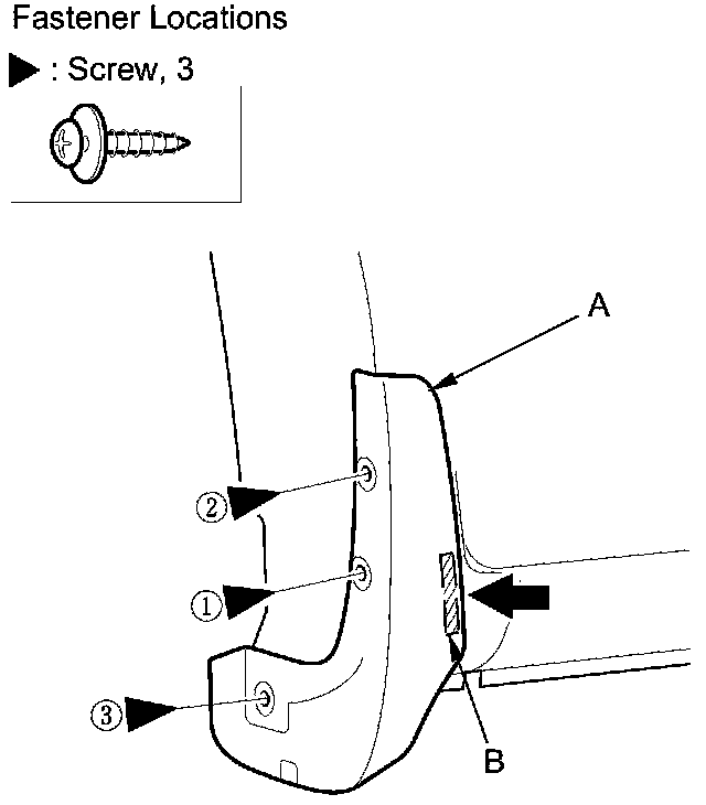 - Canada model without side sill panel: Fasten the front splash guard mounting screws in the sequence shown. Push the splash guard (A) against the body to make the adhesive (B) stick securely.