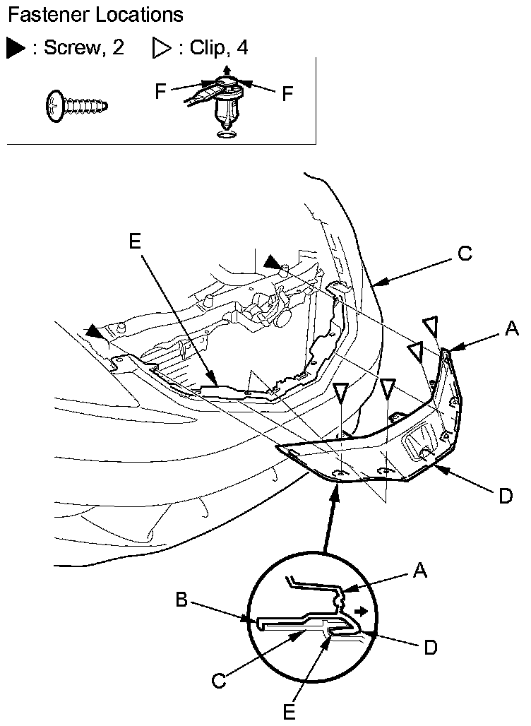 NOTE: To release the clips, pry up on the center pin at the notch (F).