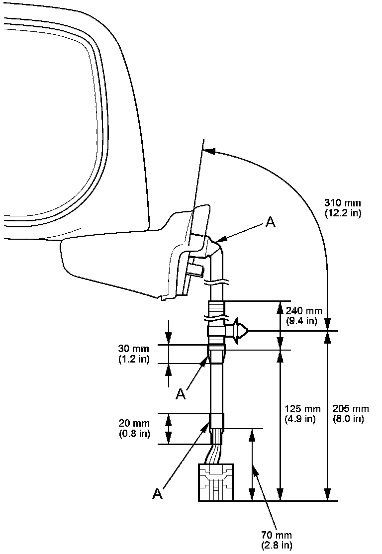 3. Disassemble the power mirror connector (A), and remove the terminals (B) from the connector.