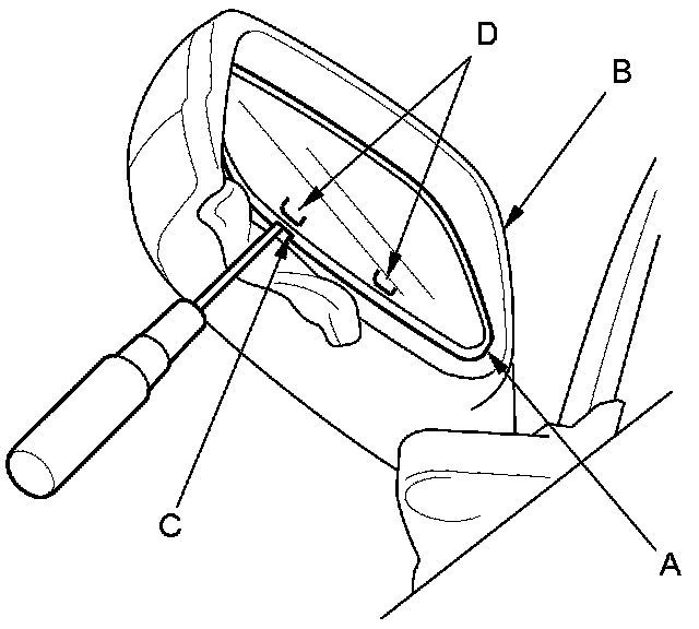 2. Put a shop towel in the opening between the lower edge of the mirror holder and the mirror housing (B) to prevent scratches. Insert a flat-tip screwdriver wrapped with protective tape through the guide notches (C) of the mirror holder, and detach the bottom clips (D).
