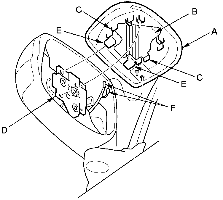 4. Separate the mirror holder from the actuator (D) by releasing the hooks (E). If equipped, disconnect the mirror defogger connectors (F).