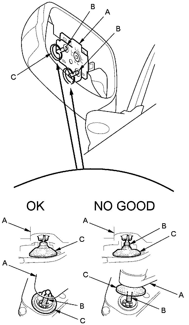 5. Before reinstalling the mirror holder to the inner holder (A) of the actuator, make sure the actuator rods (B) are securely mounted in the holes, and that the boots (C) properly cover each rod.
