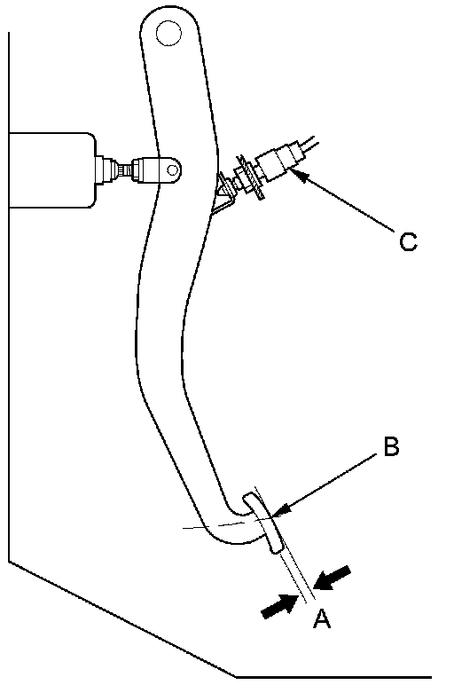 1. With the ignition switch in LOCK (0), inspect the play (A) at the brake pedal pad (B) by pushing the brake pedal by hand. If the brake pedal free play is out of specification, adjust the brake pedal position switch (C). If the brake pedal free play is insufficient, it may result in brake drag.