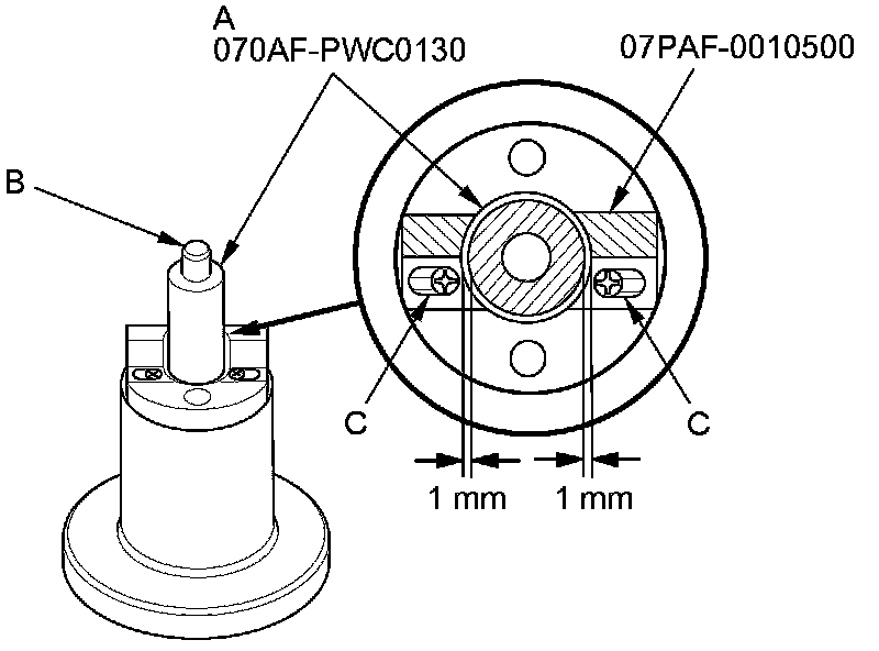 2. Temporarily install the pilot collar (A) over the pilot pin (B), and adjust the piston base head inserts as shown, then tighten the screws (C). Remove the pilot collar.
