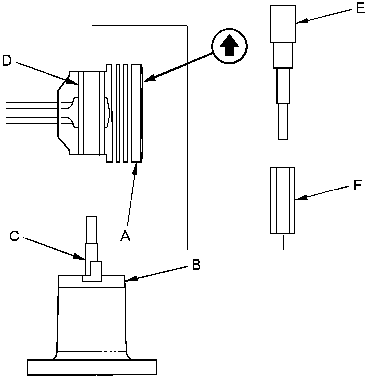 3. With the arrow on top of the piston and the embossed mark on the connecting rod facing up, place the piston assembly (B) on the special tool (C). Be sure you position the recessed flat area of the piston against the piston base head inserts (D) as shown.