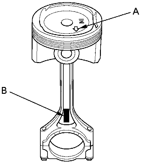 1. Assemble the piston and connecting rod with the arrow (A) and the embossed mark (B) on the same side.