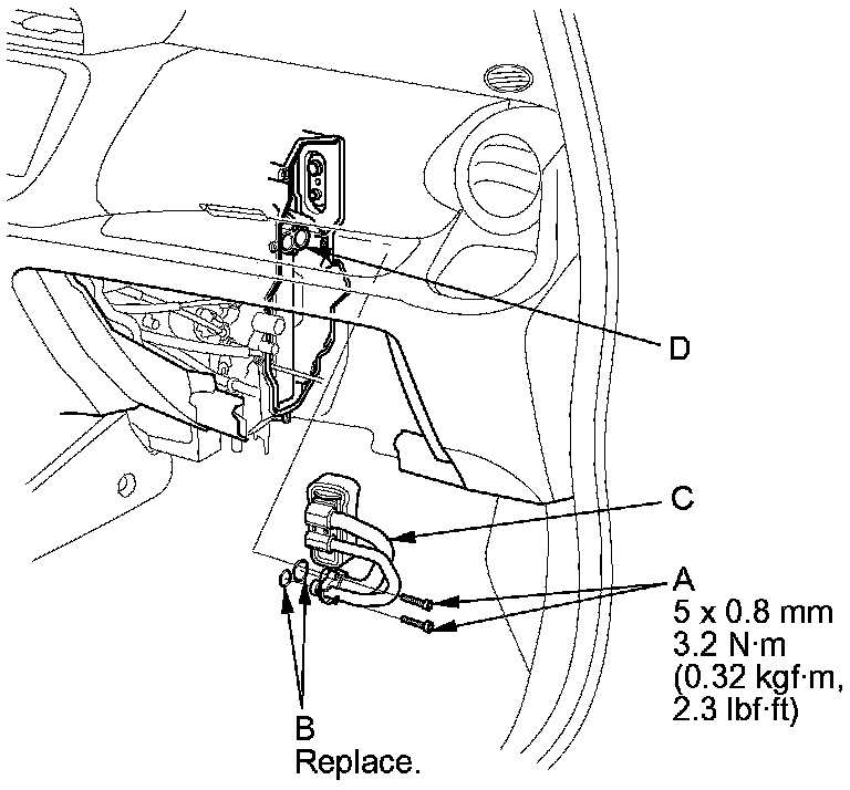 6. Remove the bolts (A), the O-rings (B), and the inlet and outlet lines (C) from the evaporator core (D). Be careful not to bend the lines.