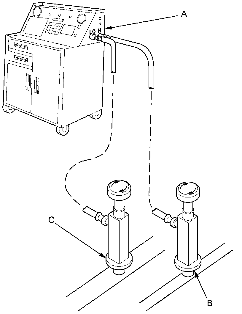 2. Connect an R-134a refrigerant recovery/recycling/charging station (A) to the high-pressure service port (B) and the low-pressure service port (C), as shown, following the equipment manufacturer's instructions. Recover the refrigerant, if any, from the A/C system A/C Refrigerant Recovery.