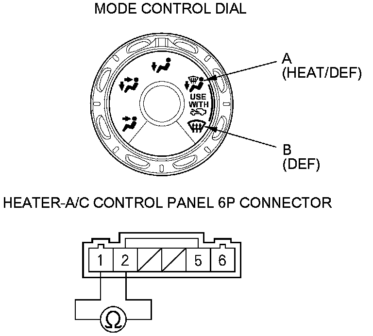 2. Check for continuity between heater-A/C control panel 6P connector terminals No. 1 and No. 2, while rotating the mode control dial from (A) and (B).