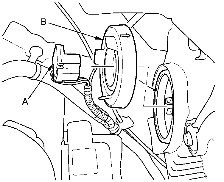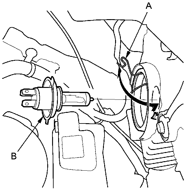 2. Pull the retaining spring (A) away from the bulb (B), then remove the bulb.