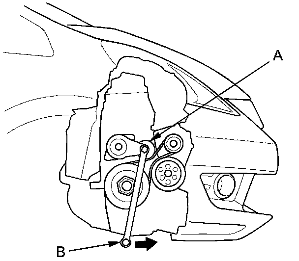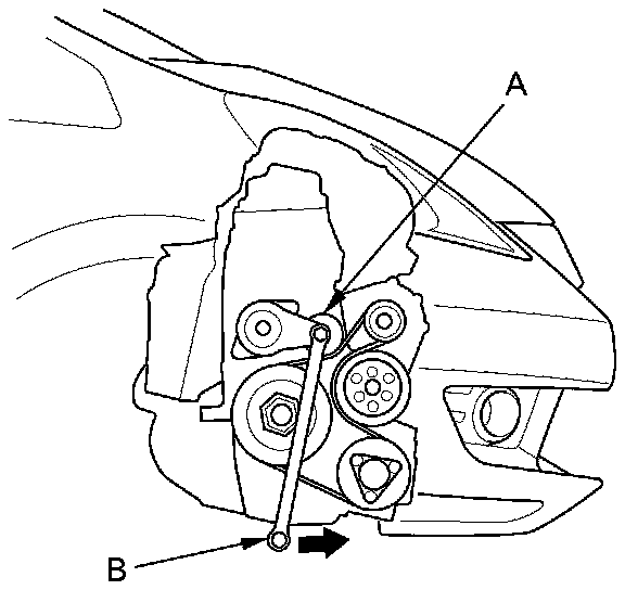 2. Move the tensioner (A) with a wrench (B) in the direction shown to relieve tension from the drive belt, then remove the drive belt.