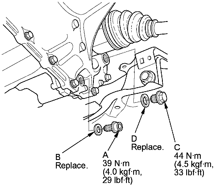 6. Install the drain plug with a new sealing washer, and refill the transmission with MTF to the proper level. Always use Honda Manual Transmission Fluid (MTF).