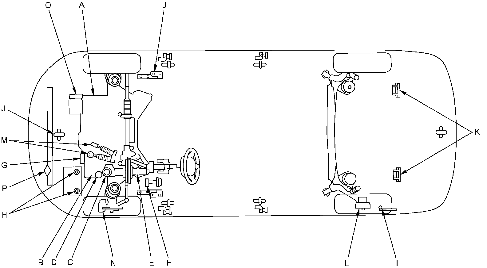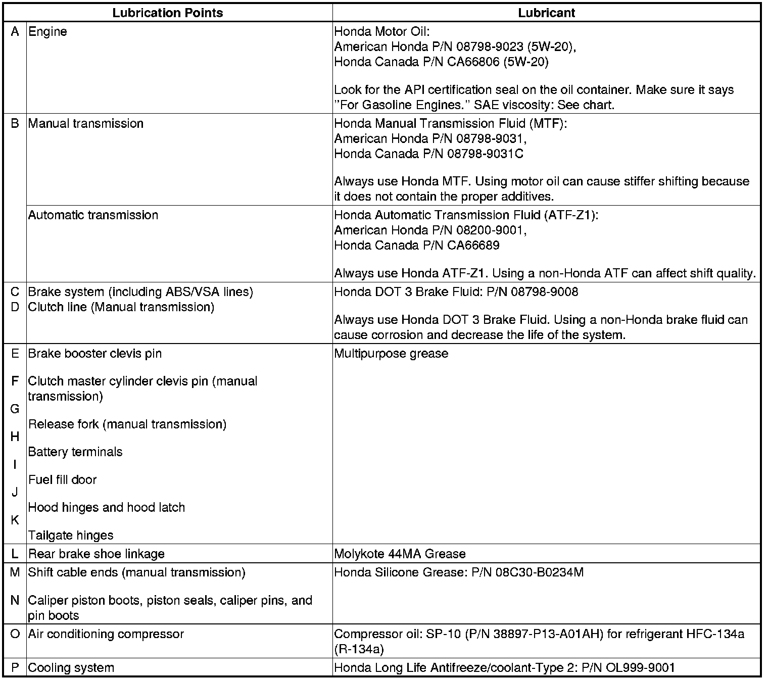- Lubricate the following areas using the recommended lubricants and fluids.