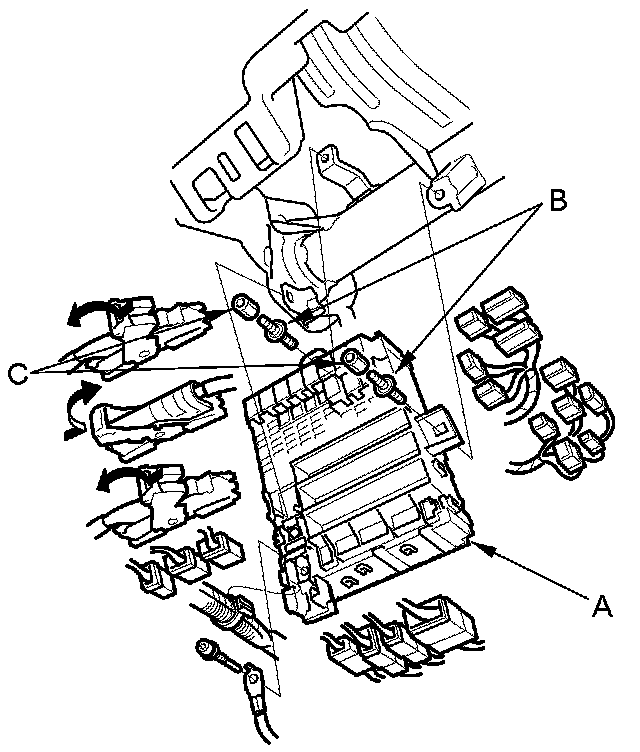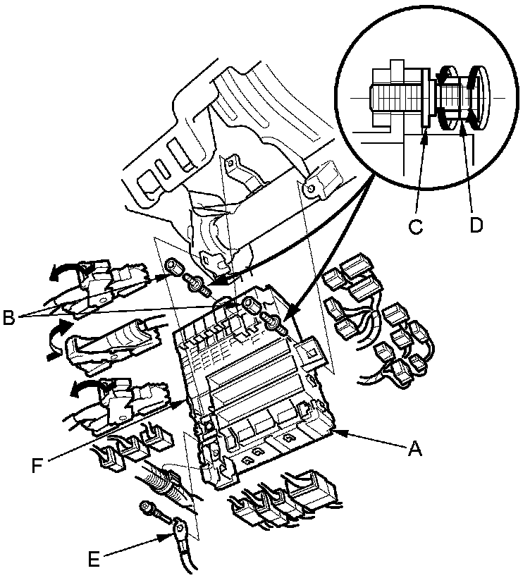 6. Release the lock (F) and pull the fuse/relay box away from the body.