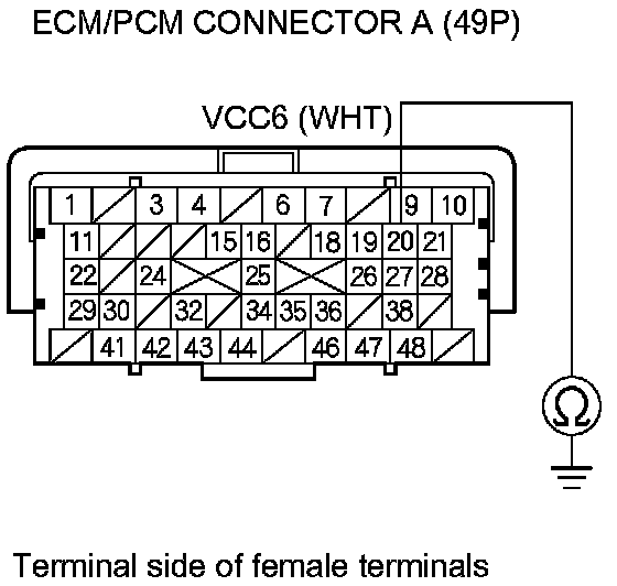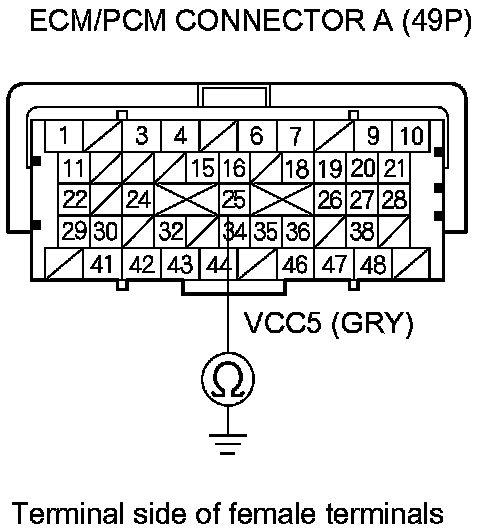 34. Check for continuity between ECM/PCM connector terminal A3 and DLC terminal No. 6.