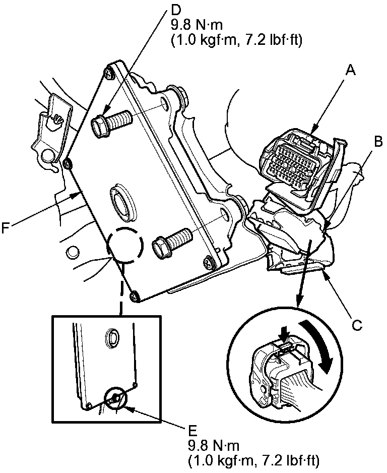11. Disconnect ECM/PCM connectors A, B, and C, then remove the ECM/PCM (F).