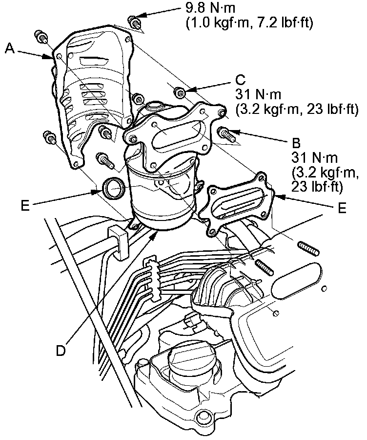 9. Install the parts in the reverse order of removal with new gaskets (E).