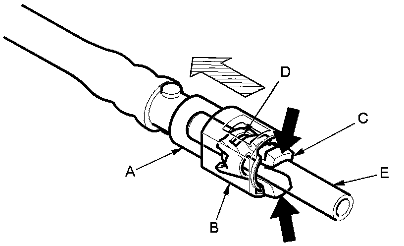 13. Disconnect the quick-connect fitting (A): Hold the connector (B) with one hand, and squeeze the retainer tabs (C) with the other hand to release them from the locking tabs (D). Pull the connector off.
