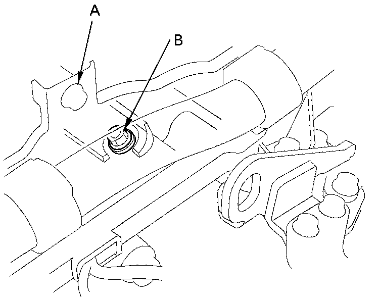 12. Remove the coolant hose bracket bolt (A). Connect the oil pressure gauge to the 1st clutch pressure inspection port (B), then temporarily install the air cleaner assembly.