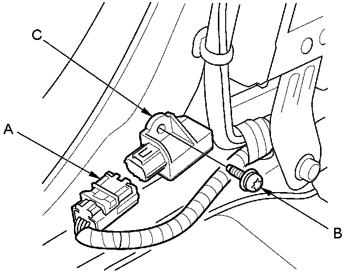 5. Remove the TORX bolt (B) using a TORX T30 bit, then remove the side impact sensor (first) (C).