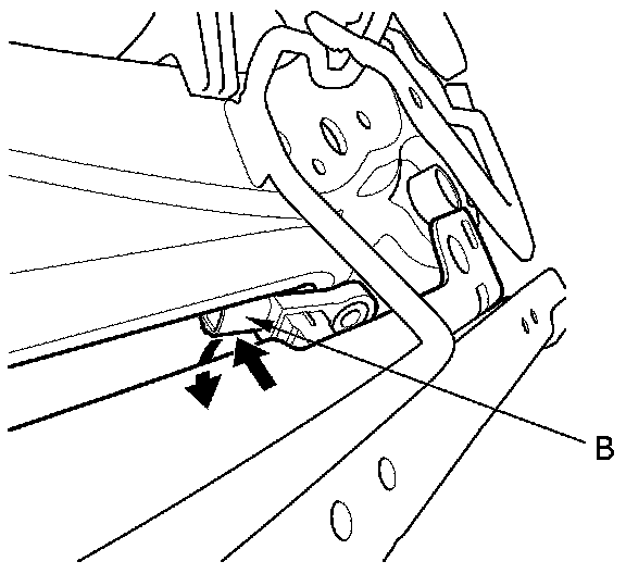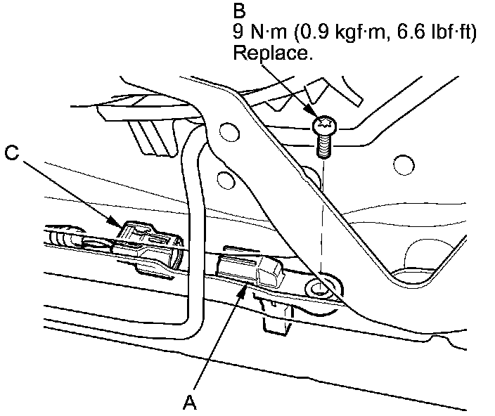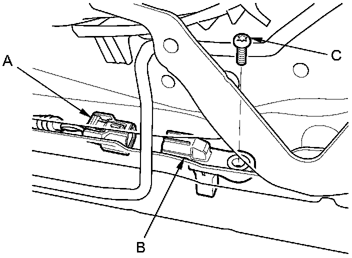 4. Remove the TORX bolt (C) using a TORX T30 bit, then remove the driver's seat position sensor (B) through the space between the seat track and slide as shown.
