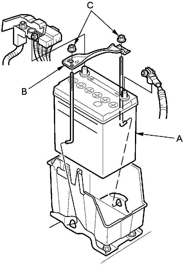 2. Remove the two nuts (A) securing the battery setting plate (B), then remove the battery setting plate and the battery (C).