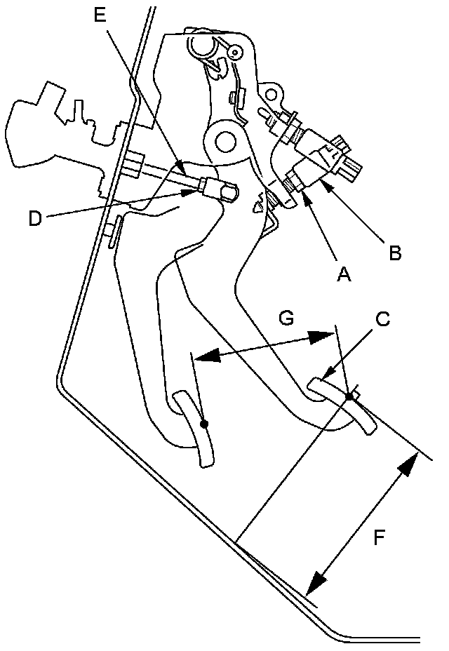 3. Loosen the clutch pushrod locknut (D), and turn the pushrod (E) in or out to get the specified height (F), and the stroke (G) at the clutch pedal. If adjusting the pushrod causes the clutch pedal to contact the clutch pedal position switch, back off the switch further.