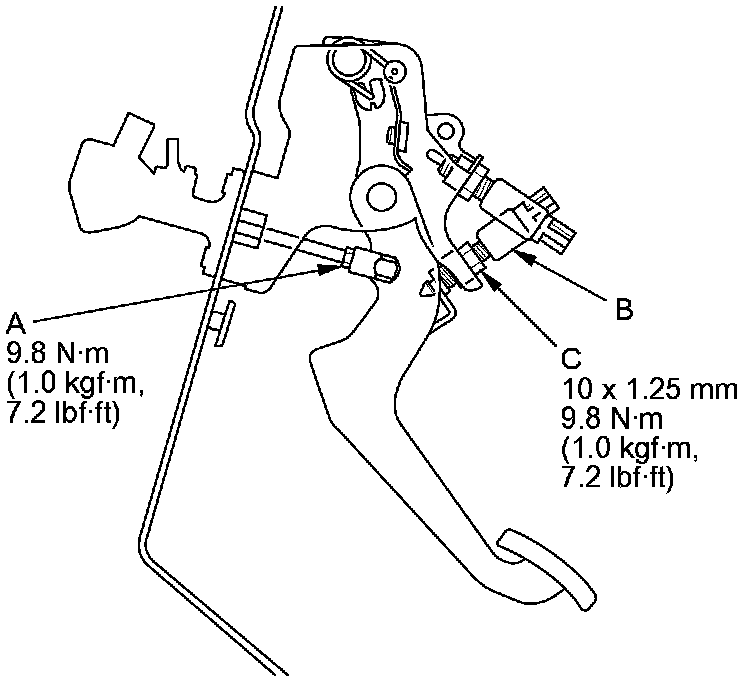 2. Loosen the clutch pedal position switch locknut (A), and back off the clutch pedal position switch (B) until it no longer touches the clutch pedal (C).
