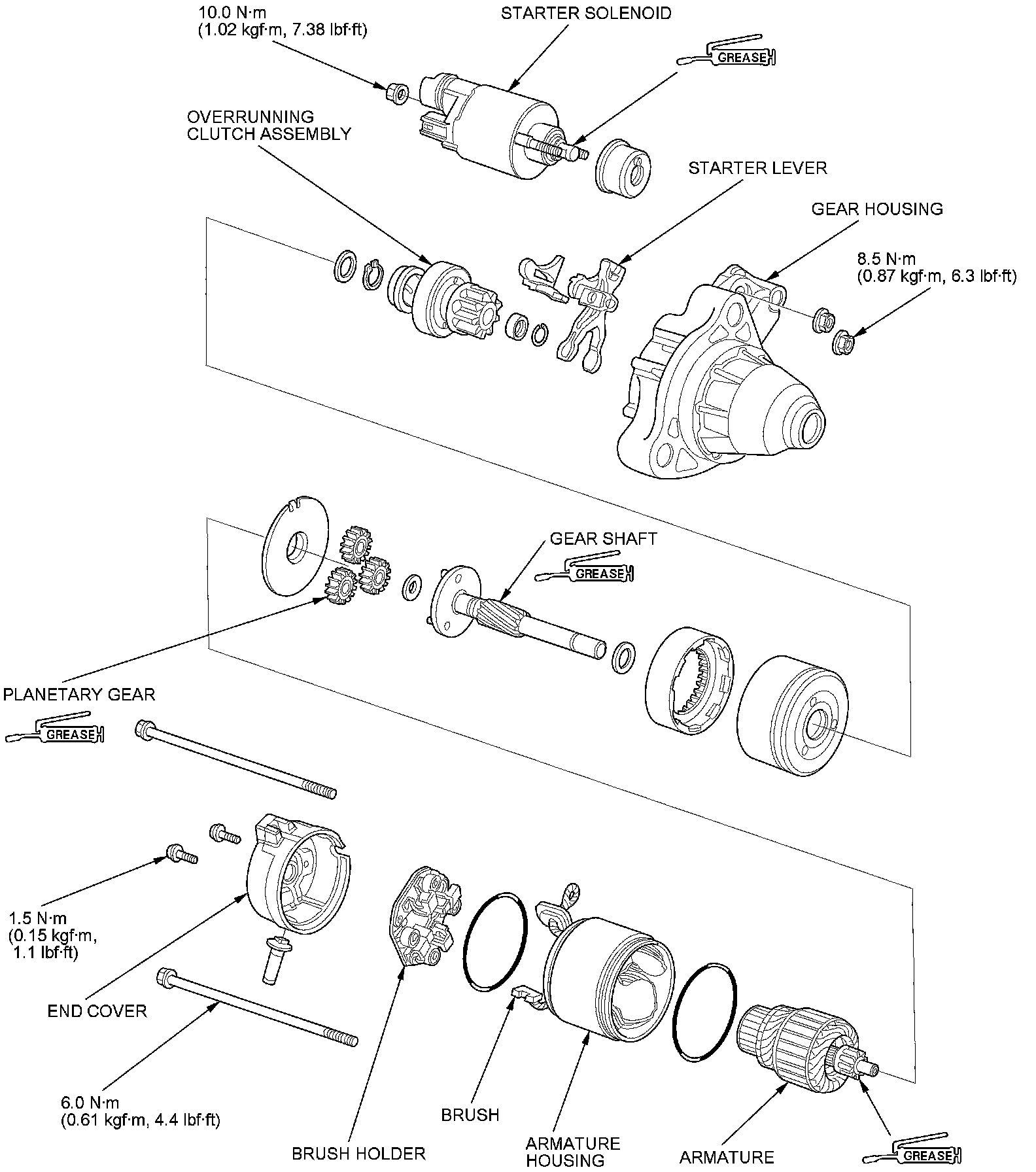 13. Check for continuity between each brush and the armature housing. If there is continuity, replace the armature housing.