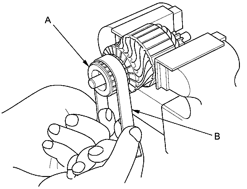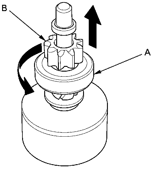 17. Hold the drive gear (B), and turn the overrunning clutch in the direction shown to make sure it turns freely. Also make sure the overrunning clutch locks in the opposite direction. If it does not lock in either direction or it locks in both directions, replace it.