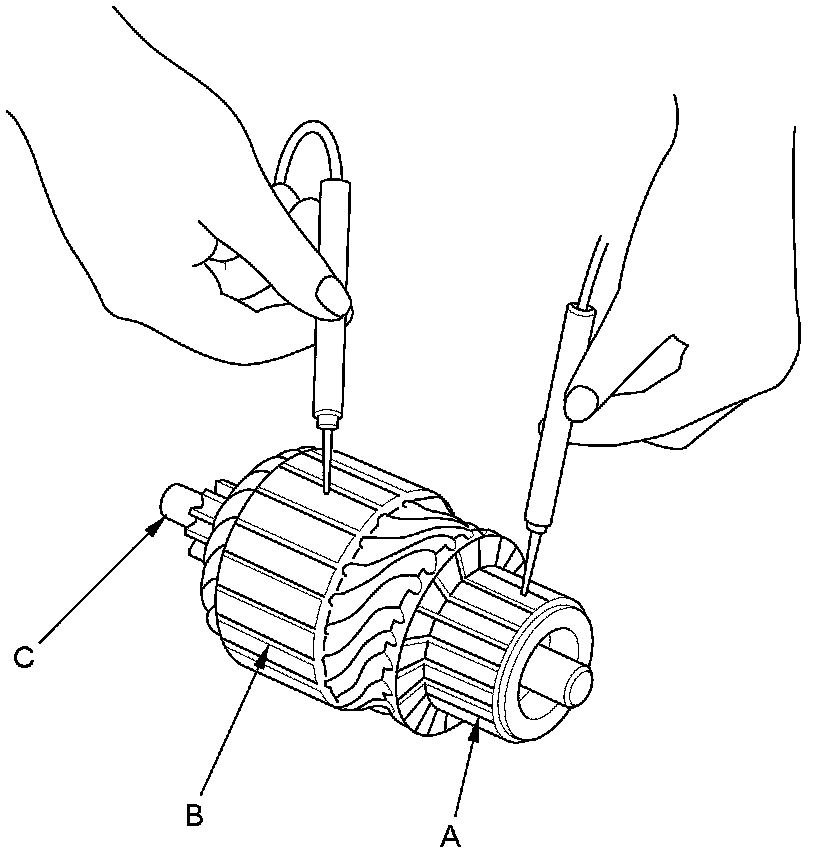 10. Use an ohmmeter to check for continuity between the commutator (A) and armature coil core (B), and between the commutator and the armature shaft (C). If there is continuity, replace the armature.
