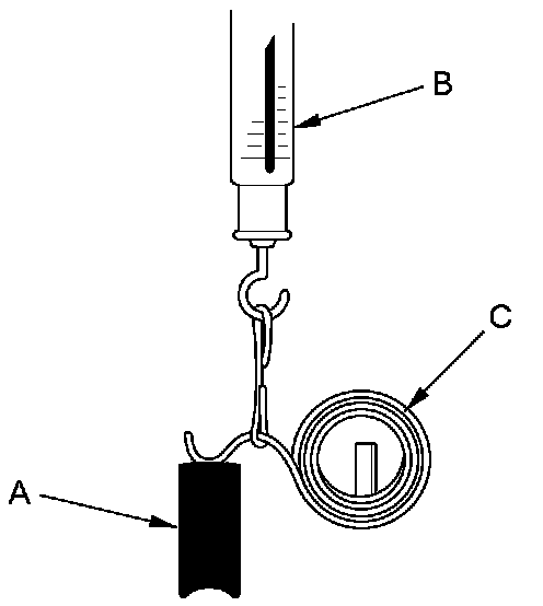 15. Insert the brush (A) into the brush holder, and bring the brush into contact with the commutator, then attach a spring scale (B) to the spring (C). Measure the spring tension at the moment the spring lifts off the brush. If it is not within the standard, replace the brush holder assembly.