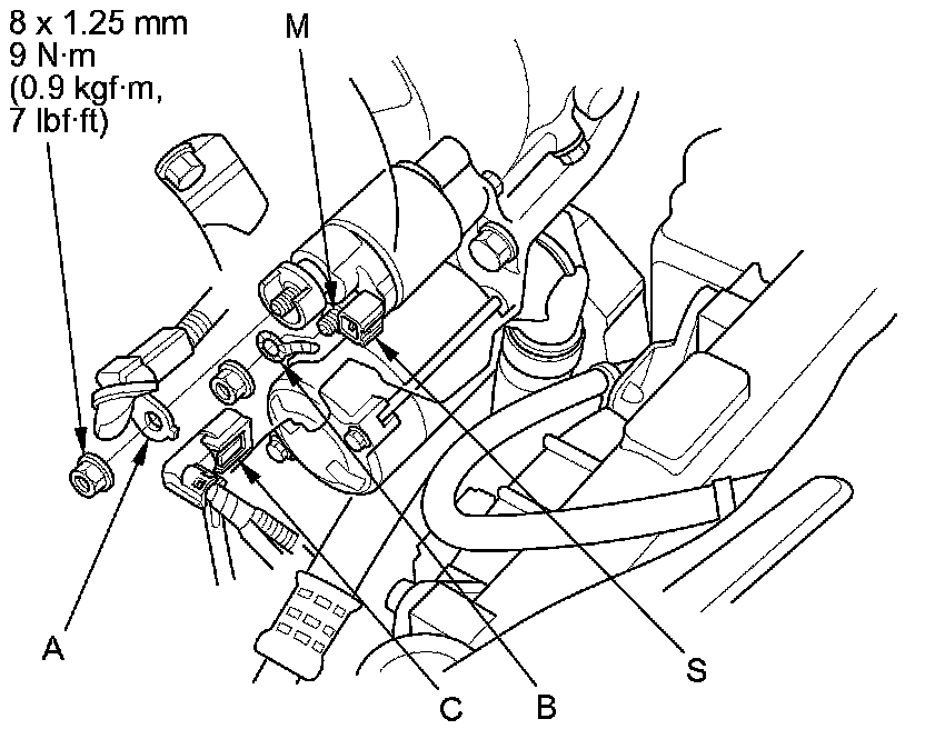 2. Remove the starter cable (A) and motor cable (B), then disconnect the connector (C).