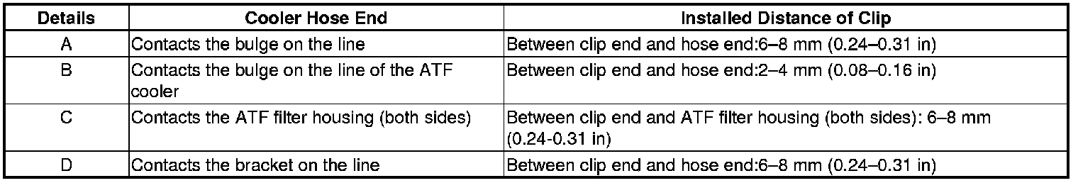 2. Install the ATF cooler hoses over the ATF cooler lines, and secure the hoses with the clips as shown in the details (A) (B) (C) (D), shown in the following figure. Keep the tabs of the clips clear of other parts.