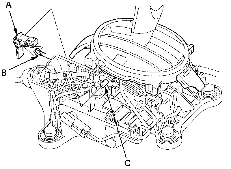 4. Apply silicone grease to the pin (C) on the shift lever bracket base, and install the shift lock release and release spring over the pin. Keep the connector terminals free of silicone grease.