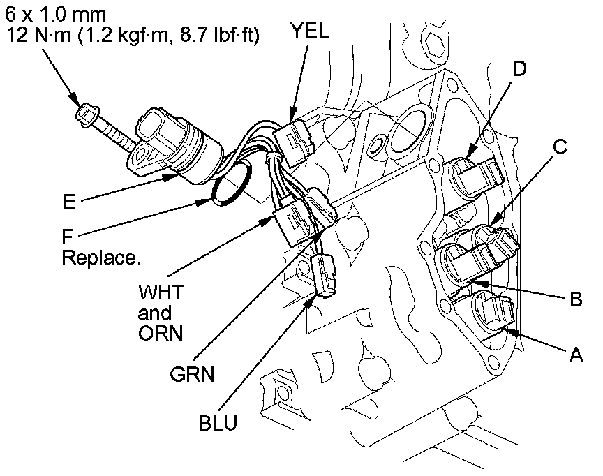 10. Install a new O-ring (F) on the new shift solenoid harness connector, and install the connector in the transmission housing.