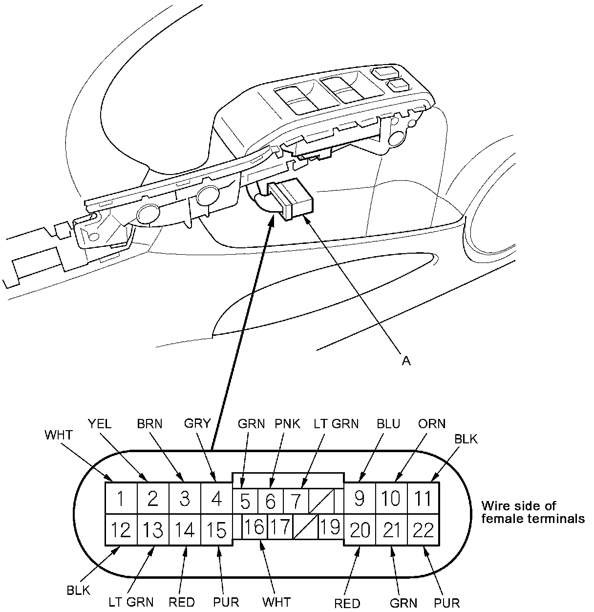 2. Disconnect the 22P connector (A) from the power window master switch.