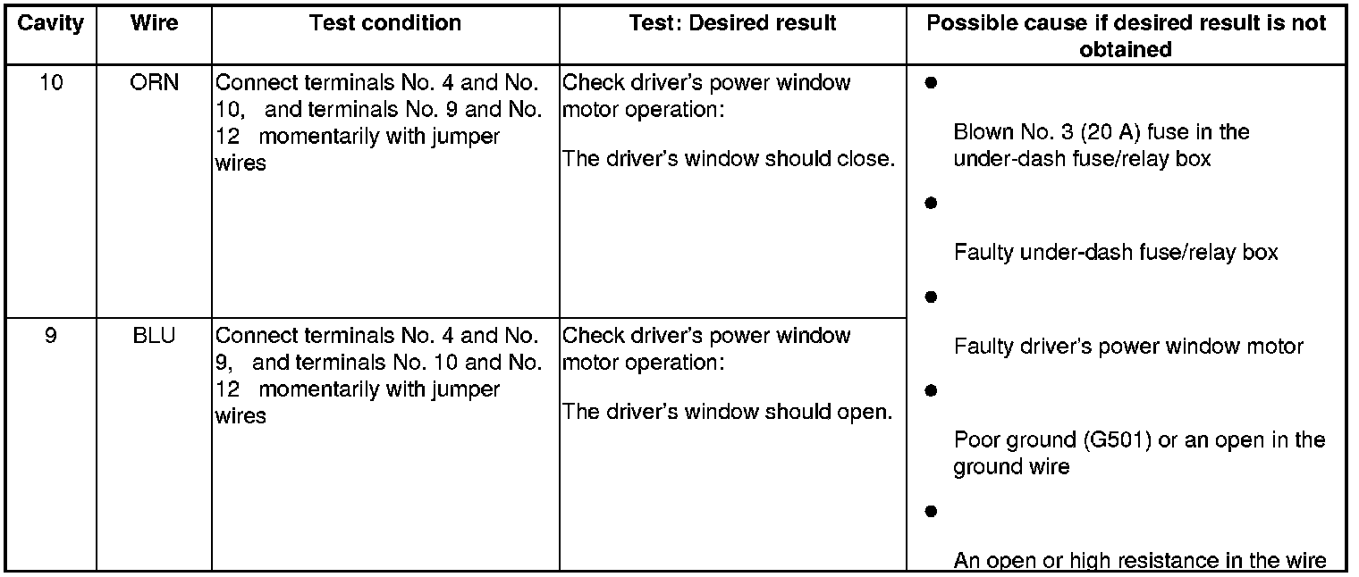 5. Reconnect the connector to the power window master switch. Turn the ignition switch to ON (II), and do these input tests at the following connector.