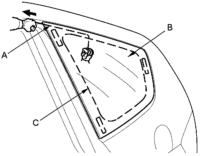 4. With a helper on the outside, pull the piano wire (A) back and forth in a sawing motion. Hold the piano wire as close to the quarter glass (B) as possible to prevent damage to the body, and carefully cut through the adhesive (C) around the entire quarter glass.