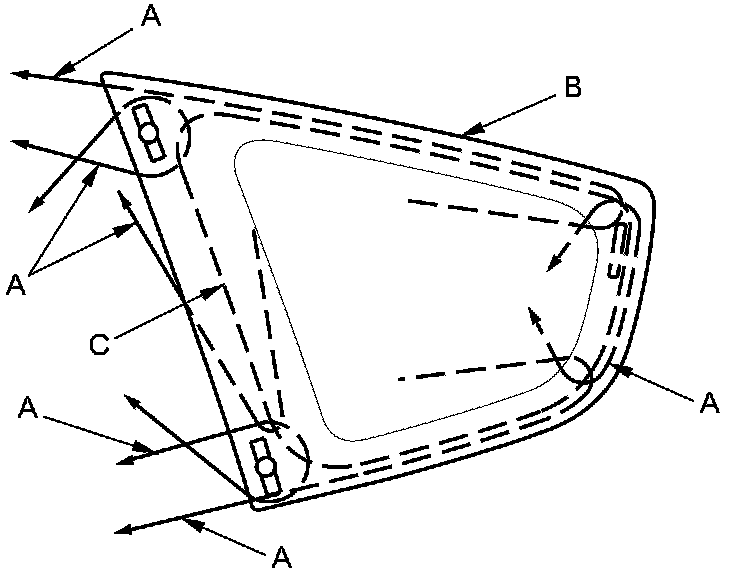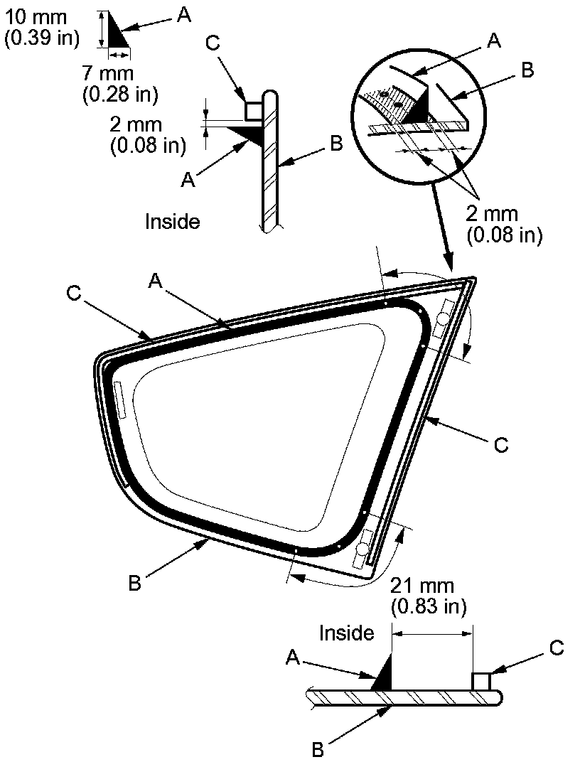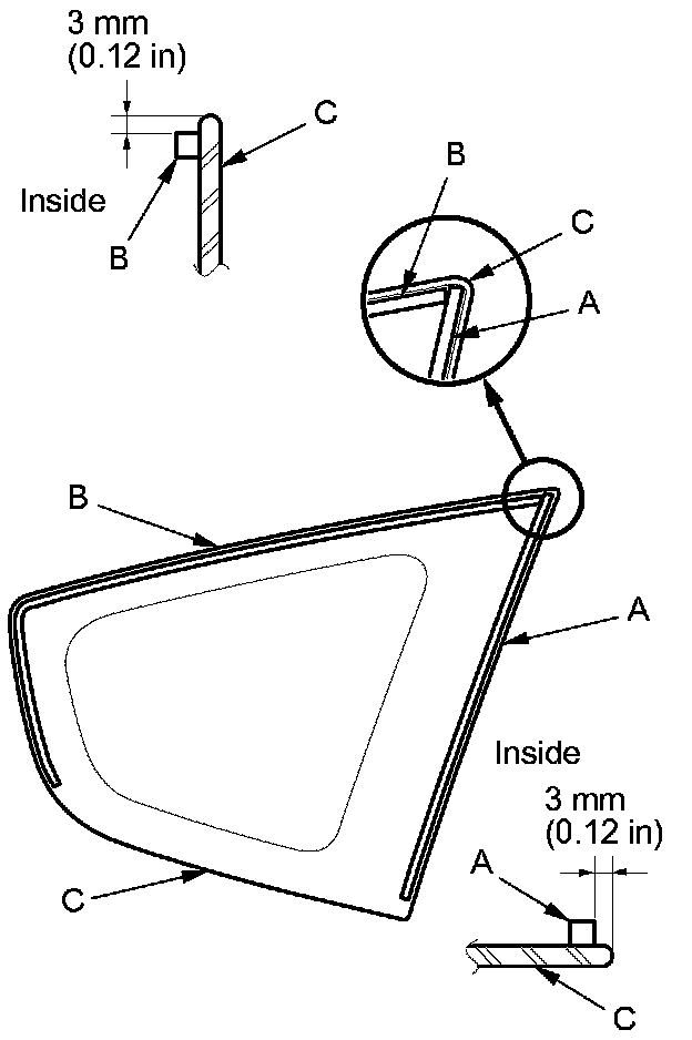 15. Put the cartridge in a caulking gun, and run a continuous bead of adhesive (A) around the edge of the quarter glass (B) and along the rubber dams (C) as shown. Apply the adhesive to the corner portions of the quarter glass, using the printed dots on the glass as a guide. Apply the adhesive within 30 minutes after applying the glass primer. Make a slightly thicker bead at each corner.