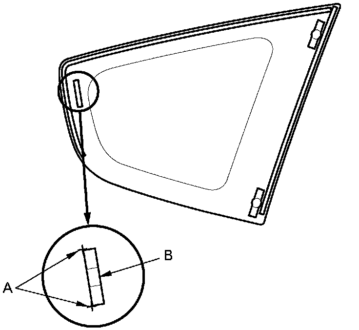 8. If you are reinstalling the old quarter glass, make alignment marks (A) along the edge of the old rear clip (B) as shown for installing the new rear clip.