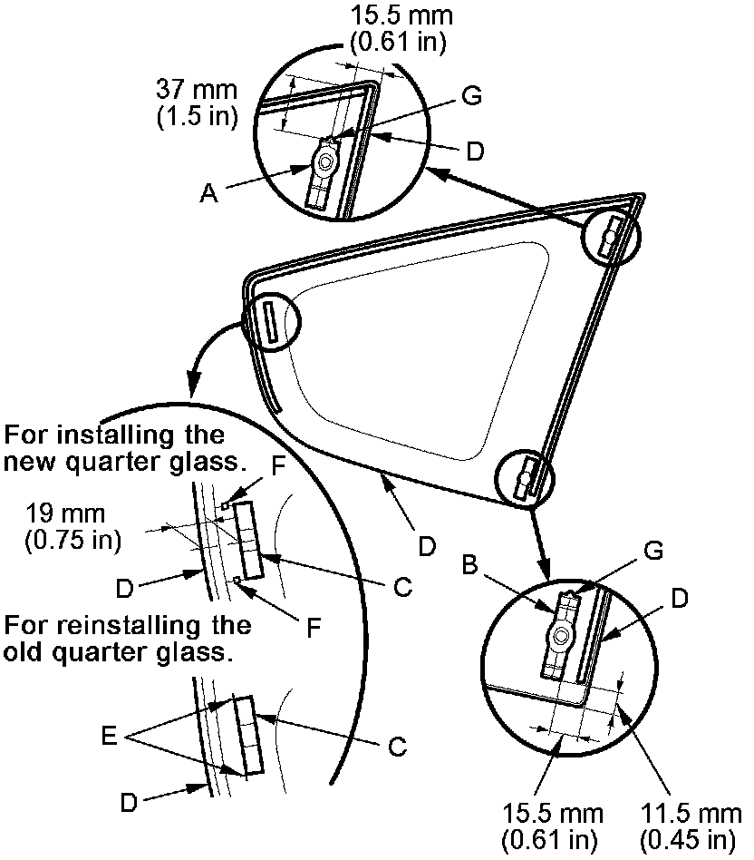 - If you are reinstalling the old quarter glass, align clip C with the alignment marks (E) you made in step 8.
