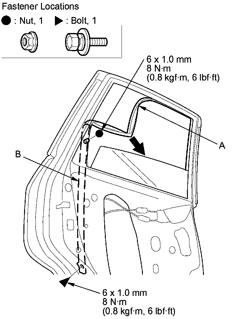 5. Pull the glass run channel (A) away as needed. Loosen the nut, and remove the bolt securing the rear lower channel (B).