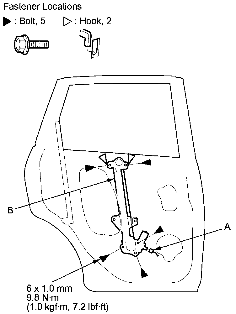 10. Remove the bolts, pull the regulator up to release the hooks, then remove the regulator through the hole in the door.