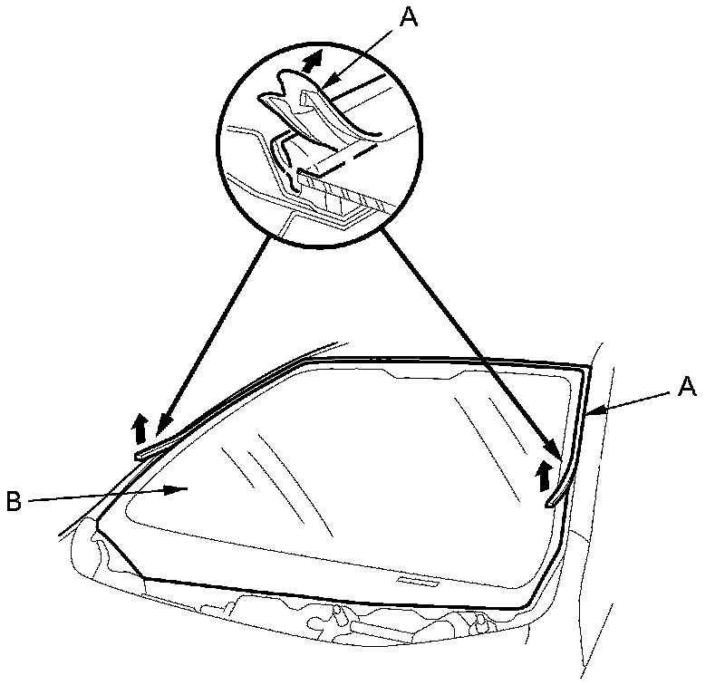 2. Remove the molding (A) from the edge of the windshield (B). If necessary, cut the molding with a utility knife.