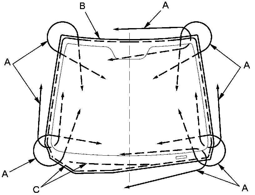 16. Apply a light coat of glass primer to the windshield (A) along the edge of the molding (B) and the rubber dams (C) as shown, then lightly wipe it off with gauze or cheesecloth:
